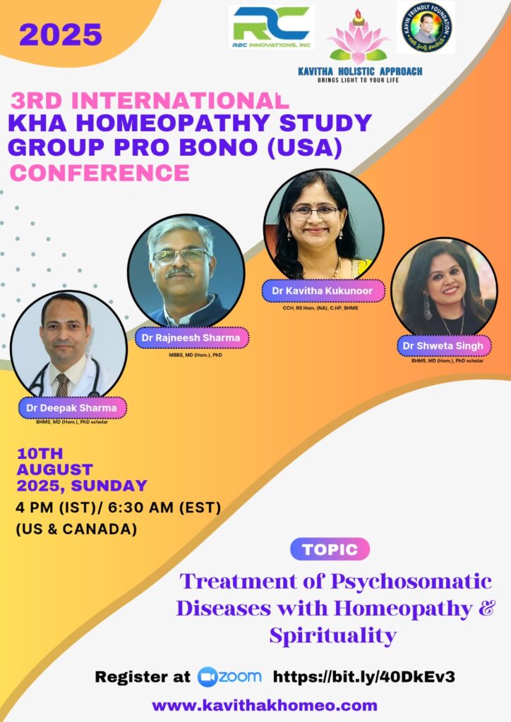KHA Homeopathy Study Group Hosted by KAVITHA HOLISTIC APPROACH welcomes you to 3rd International KHA Homeopathy Conference Date: Aug 10th, 2025   Time: 4 PM IST / 6:30 AM EST(US/CAN)   Topic: Treatment of Psychosomatic Diseases with Homeopathy & Spirituality Speakers of the Conference Dr Rajneesh Kumar Sharma MBBS, MD(Hom.), PhD   Dr. Kavitha Kukunoor