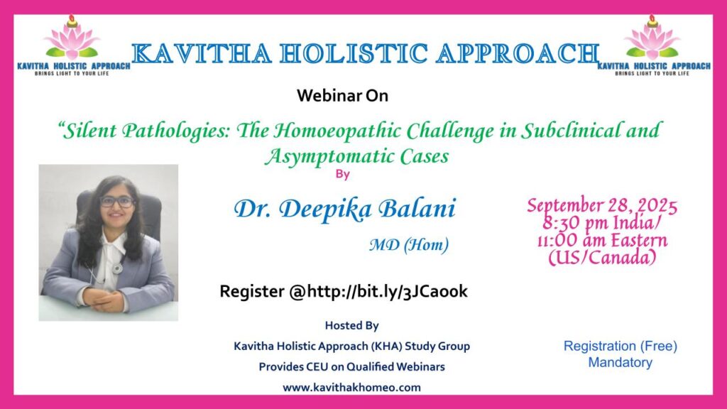KHA Homeopathy Study Group Hosted by KAVITHA HOLISTIC APPROACH welcomes you to KHA Webinar – September 2025 Date: September 28th, 2025 Time: 8:30 PM IST / 11:00 AM EST(US/CAN) Topic: “Silent Pathologies: The Homoeopathic Challenge in Subclinical and Asymptomatic Cases” Speaker of the Month Dr Deepika Balani   BHMS, MD(Hom) Registration mandatory http://bit.ly/3JCao0k Contact for