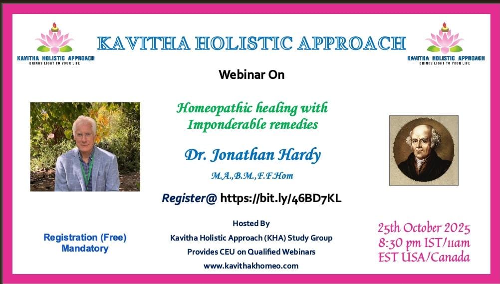 KHA Homeopathy Study Group Hosted by KAVITHA HOLISTIC APPROACH welcomes you to KHA Webinar – October 2025 Date & Time: October 25th 2025 TIME 8:30pm IST/11am EST Speaker of the Month : Dr. Jonathan Hardy M.A.,B.M.,F.F.Hom Topic: Homeopathic healing with Imponderable remedies Registration mandatory http://bit.ly/46BD7KL