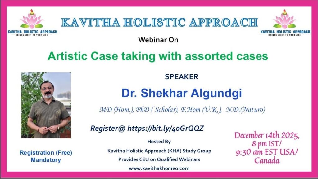 KHA Homeopathy Study Group Hosted by KAVITHA HOLISTIC APPROACH welcomes you to KHA Webinar – December 2025 Date: December 14th, 2025 Time: 8 PM IST / 9:30 AM EST(US/CAN) Topic: “Artistic case taking with assorted cases” Speaker of the Month Dr Shekhar Algundgi, MD(Hom), PhD Scholar, F. Hom(UK), ND (Naturo) Registration mandatory https://bit.ly/4oGrQQZ Contact for