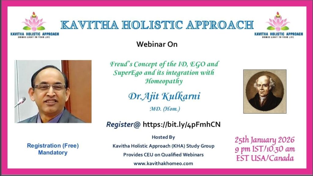 KHA Homeopathy Study Group Hosted by KAVITHA HOLISTIC APPROACH welcomes you to KHA Webinar – January 2026 Date: 25th January , 2026 Time: 9 PM IST / 10:30 AM EST(US/CAN)   Topic: “ Freud’s Concept of the ID, EGO and SuperEgo and its integration with Homeopathy ” Speaker of the Month: Dr Ajit Kulkarni, MD(Hom)